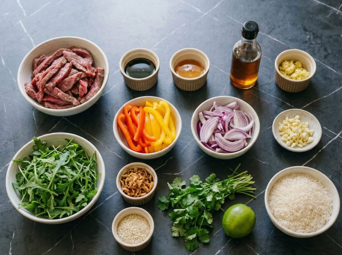 - Dresser dans des bols : riz, roquette fraîche, légumes sautés, bœuf caramélisé. Parsemer d'oignons crispy, graines de sésame et coriandre. Servir avec quartiers de citron vert.