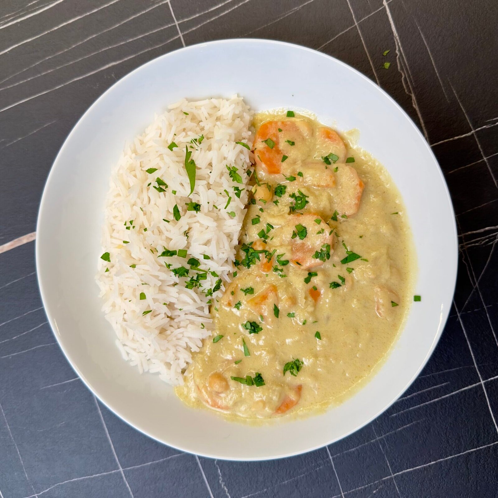 - Servir sur riz basmati avec coriandre fraîche. CASSEROLE : Hacher oignon, ail, gingembre. Faire revenir 3 min. Ajouter curry 1 min. Ajouter légumes, lait de coco, bouillon. Mijoter 12-15 min. Ajouter épinards, sauce soja, citron. Cuire 2 min.